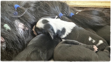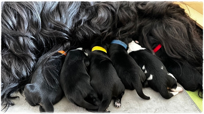 Am 06.03.2026 sind unsere kleinen Erdenbürger geboren. Innerhalb von 2 Stunden erblickten 2 Rüden und 4 Hündin das Licht der großen weiten Welt. Auf den Bildern sind die Welpen ein paar Stunden alt . Die Gewichte sind von 240g-215g und auf den ersten Blick alle schwarz mit weißen Abzeichen. Einen kleinen Blickfang haben wir natürlich in unserem Wurf, eine Hündin ist schwarz/weiß .
