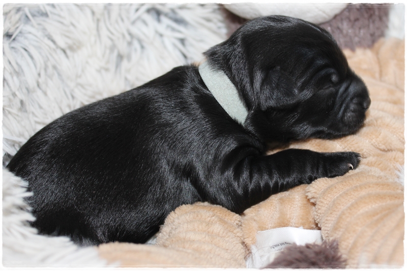 Rüde hellblau:   Farbe schwarz mit weißen Brustfleck,     Geburtsgewicht: 215g